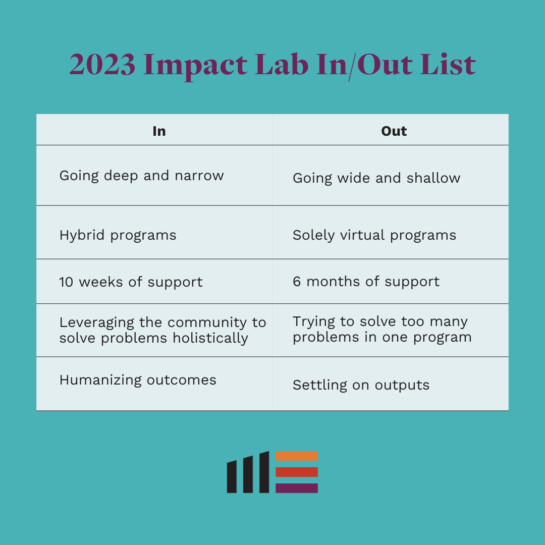 In 2022, we allowed ourselves the space to get it wrong. Not a lot of organizations do that. In the Impact Lab, we change things so often because we live by Maya Angelou’s wisdom -- when we know better, we do better. I hope these lessons are useful to other nonprofits and funders in this industry, because we all have a responsibility to provide services that actually effect change. We are looking forward to this new year, feeling inspired by the ecosystem partners who have been by our side for these past few years, and feeling motivated to continue supporting the community in the ways they need it most.
